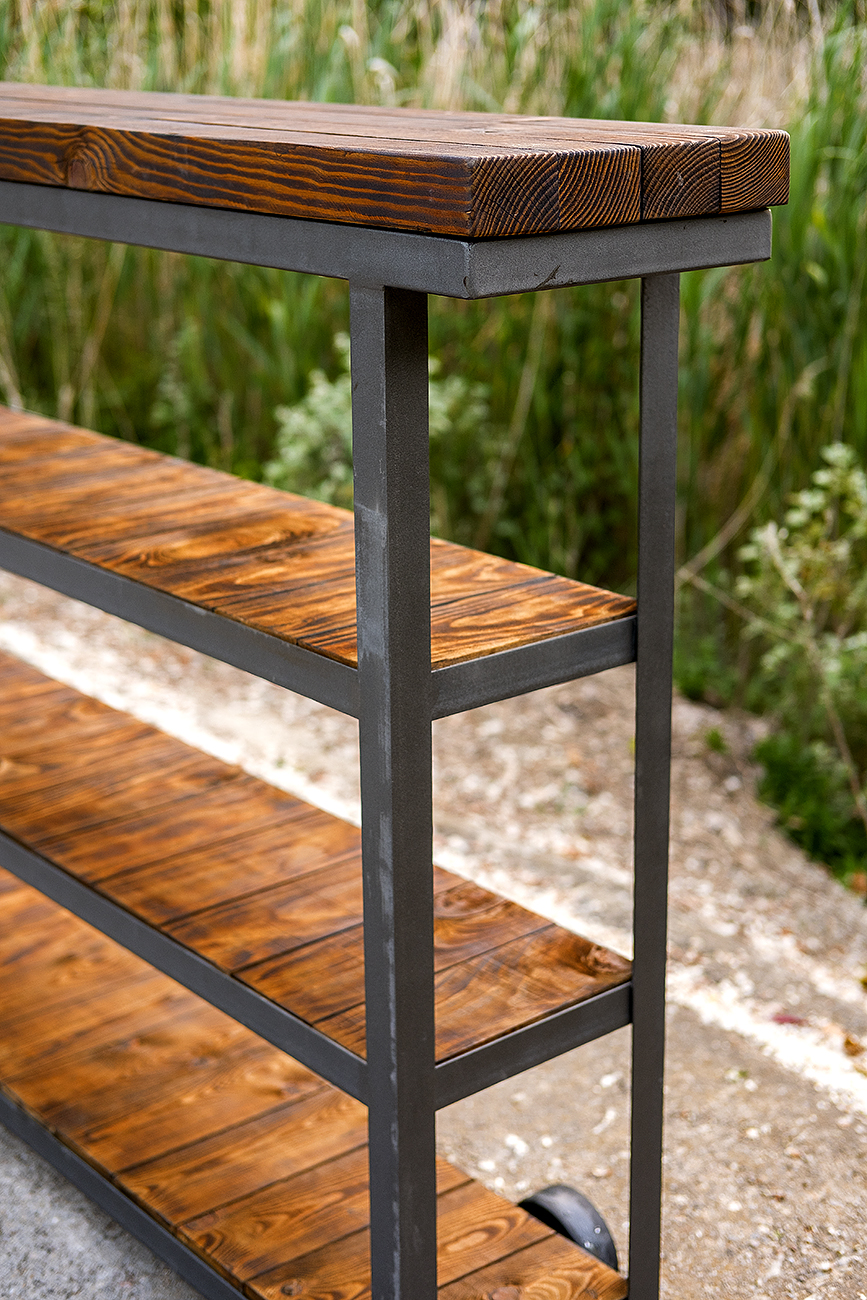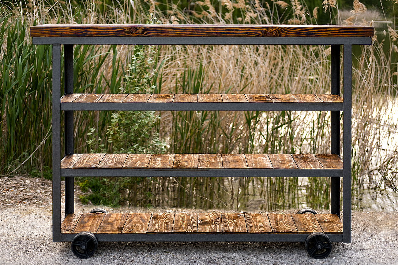 Mueble construido en acero y madera de pino quemada artesanalmente,